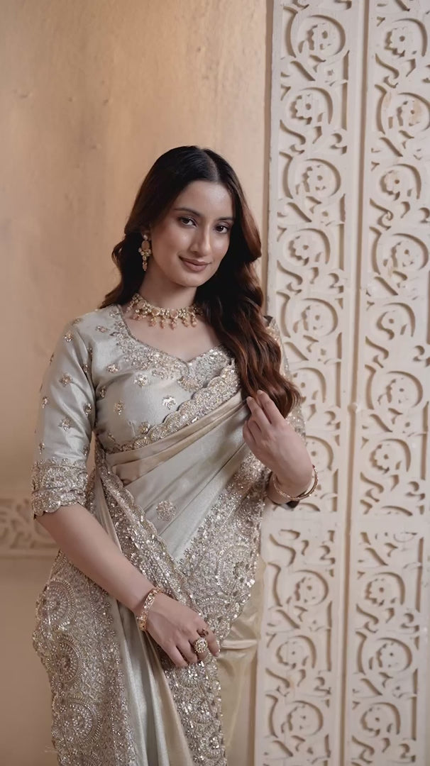 Nayoora Luxe Metallic Silver Grey Zardozi Silk Saree