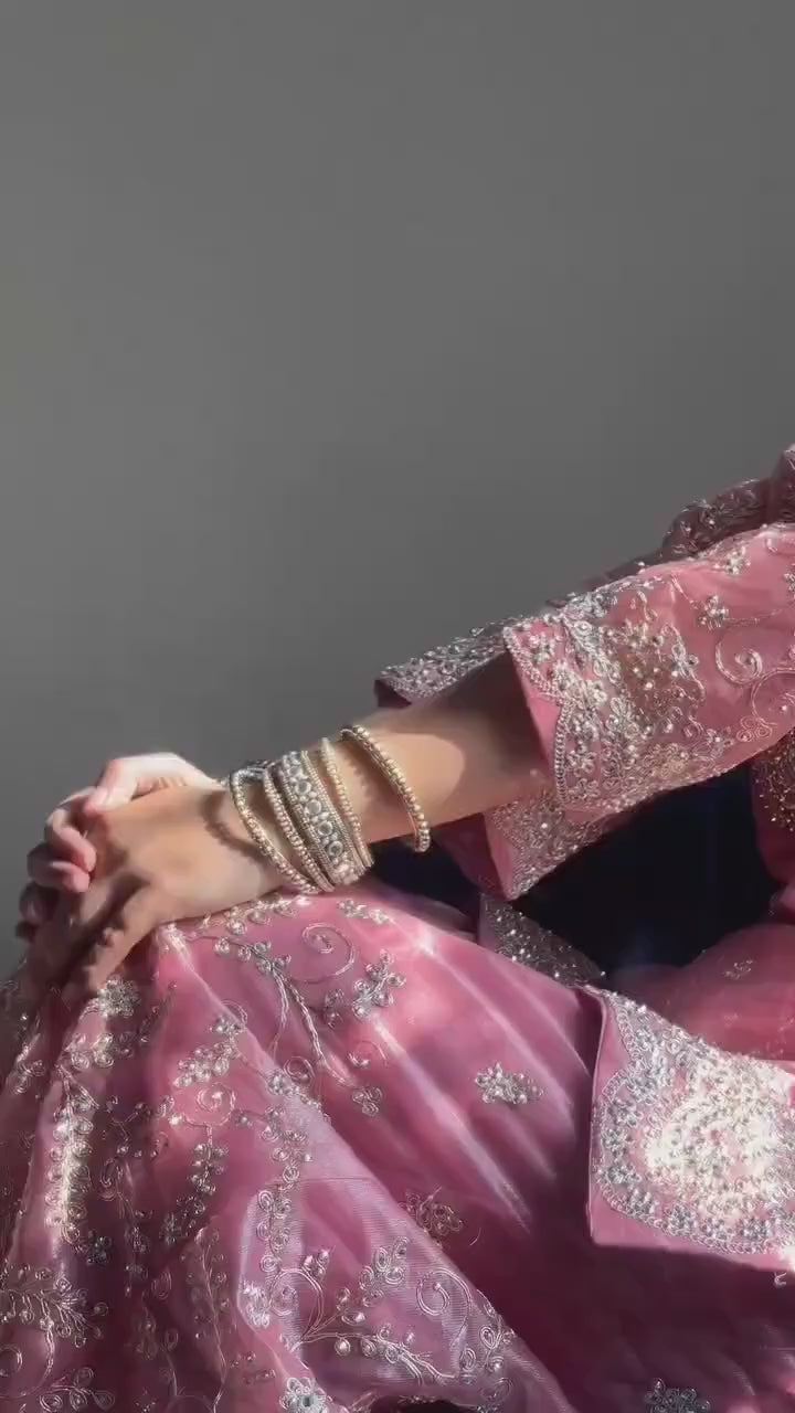 Presenting the Nayoora Onion Jimmy Choo Embroidered Palazzo Suit — a luxurious festive ensemble crafted for elegant celebrations. Designed in premium Jimmy Choo fabric, this outfit features rich embroidery highlighted with sequin, coding dori and moti handwork.