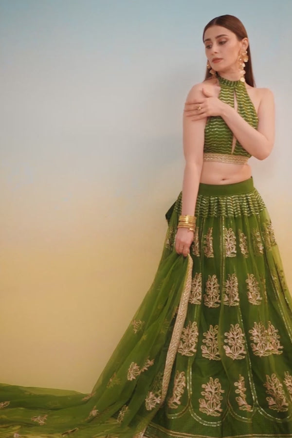 Step into a fairytale with the Nayoora Premium Butterfly Net Sequin Lehenga. This masterpiece features voluminous Butterfly Net adorned with intricate tone-on-tone cotton thread work and shimmering sequins.